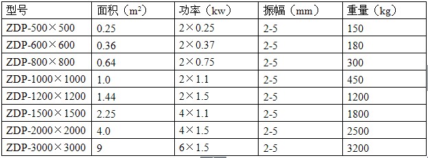 注:此表為上、下振形式振動平臺技術(shù)參數(shù),僅供參考;此外可以根據(jù)用戶實際使用需要定做臺面大小來選用振動電機(jī)數(shù)量及功率。